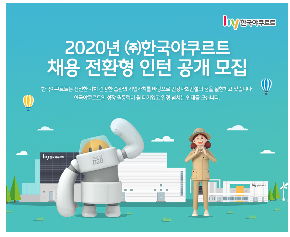 한국야쿠루트가 '2020년 ㈜한국야쿠르트 채용 전환형 인턴 공개 모집'을 시작합니다.